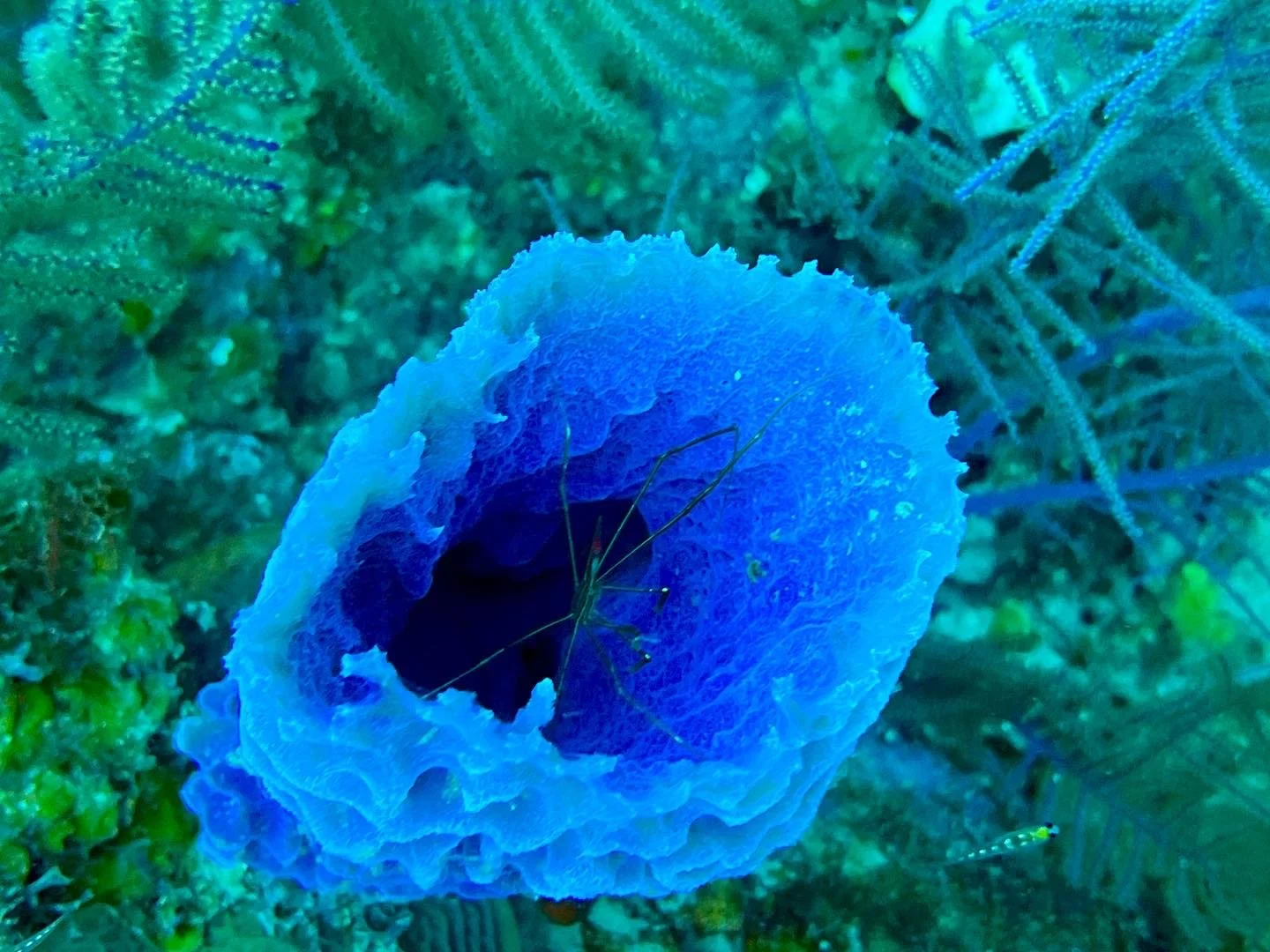 A bright blue jellyfish with ruffled edges floating underwater amidst green marine plants, with small shrimp nearby.
