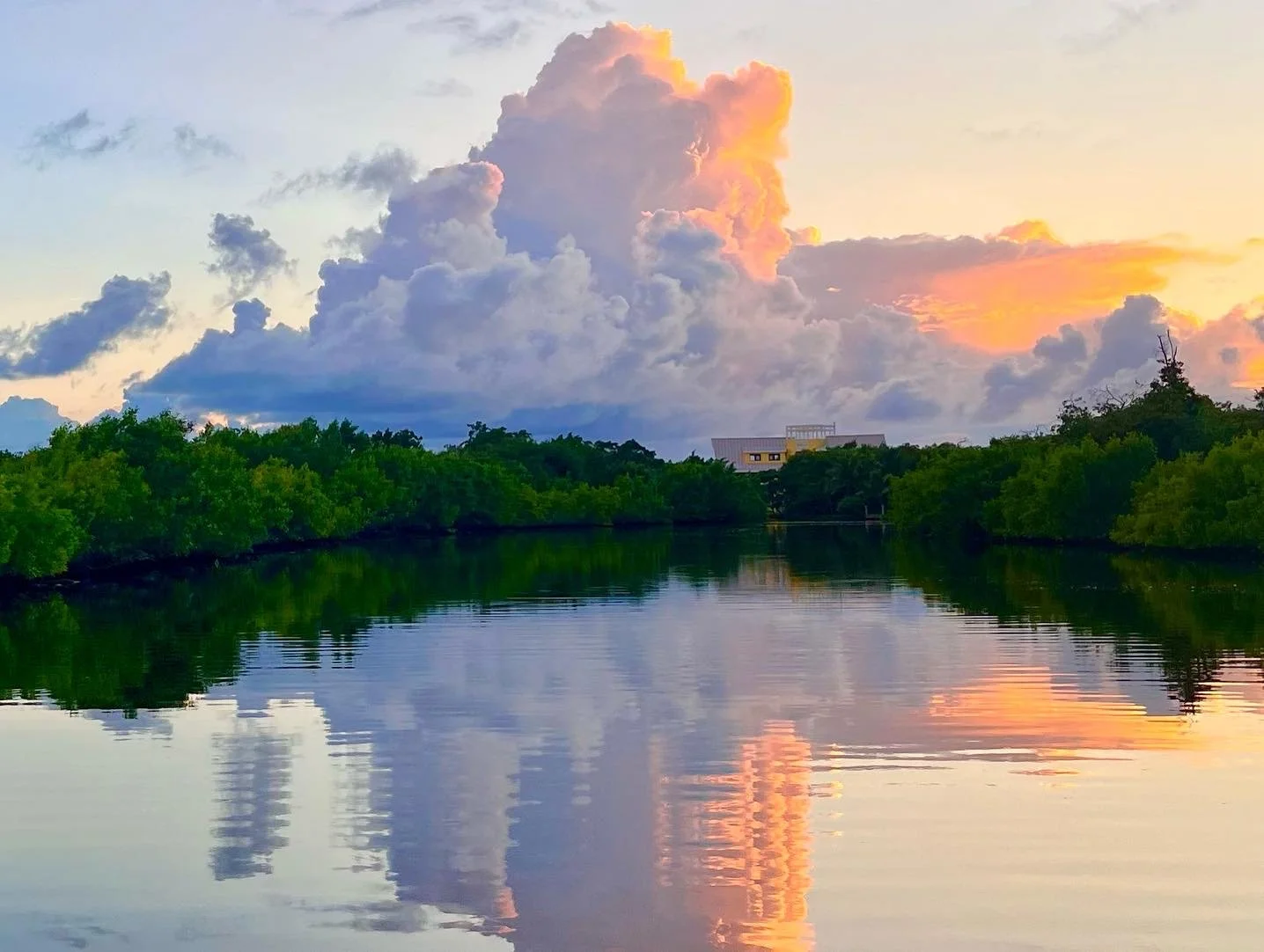 Calm river with lush green trees on either side, reflecting a cloudy sunset sky with vibrant pink, orange, and blue hues.
